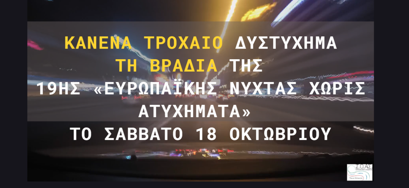 Κανένα τροχαίο δυστύχημα τη βραδιά της πανελλαδικής εκδήλωσης του Ι.Ο.ΑΣ. «Πάνος Μυλωνάς» 19η «Ευρωπαϊκή Νύχτα χωρίς Ατυχήματα», το Σάββατο 18 Οκτωβρίου